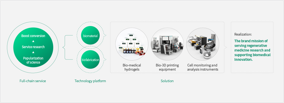 EFL provides a comprehensive solution for reliable and efficient regenerative medicine researchers by building two technology platforms, biomaterials and biomanufacturing, and offering bio-medical hydrogels, processing and manipulation equipment, monitoring and analysis instruments, etc. This helps to efficiently empower the entire process of regenerative medicine research to translation.