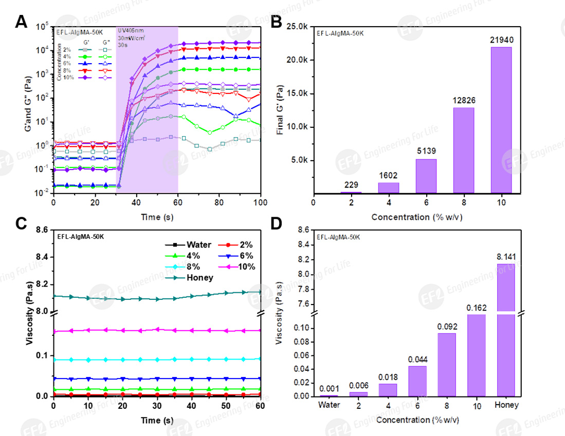 Fig 2. Rheological properties of AlgMA-50K at different concentrations: (A) photocrosslinking process; (B) storage modulus G’ after curing; (C, D) viscosity (honey and water as controls)