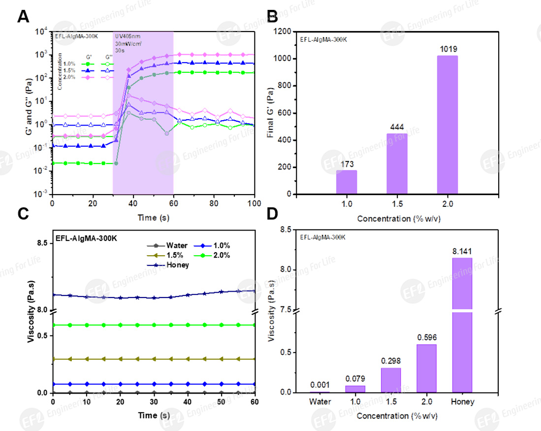 Fig 3. Rheological properties of AlgMA-300K at different concentrations: (A) photocrosslinking process; (B) storage modulus G’ after curing; (C, D) viscosity (honey and water as controls)