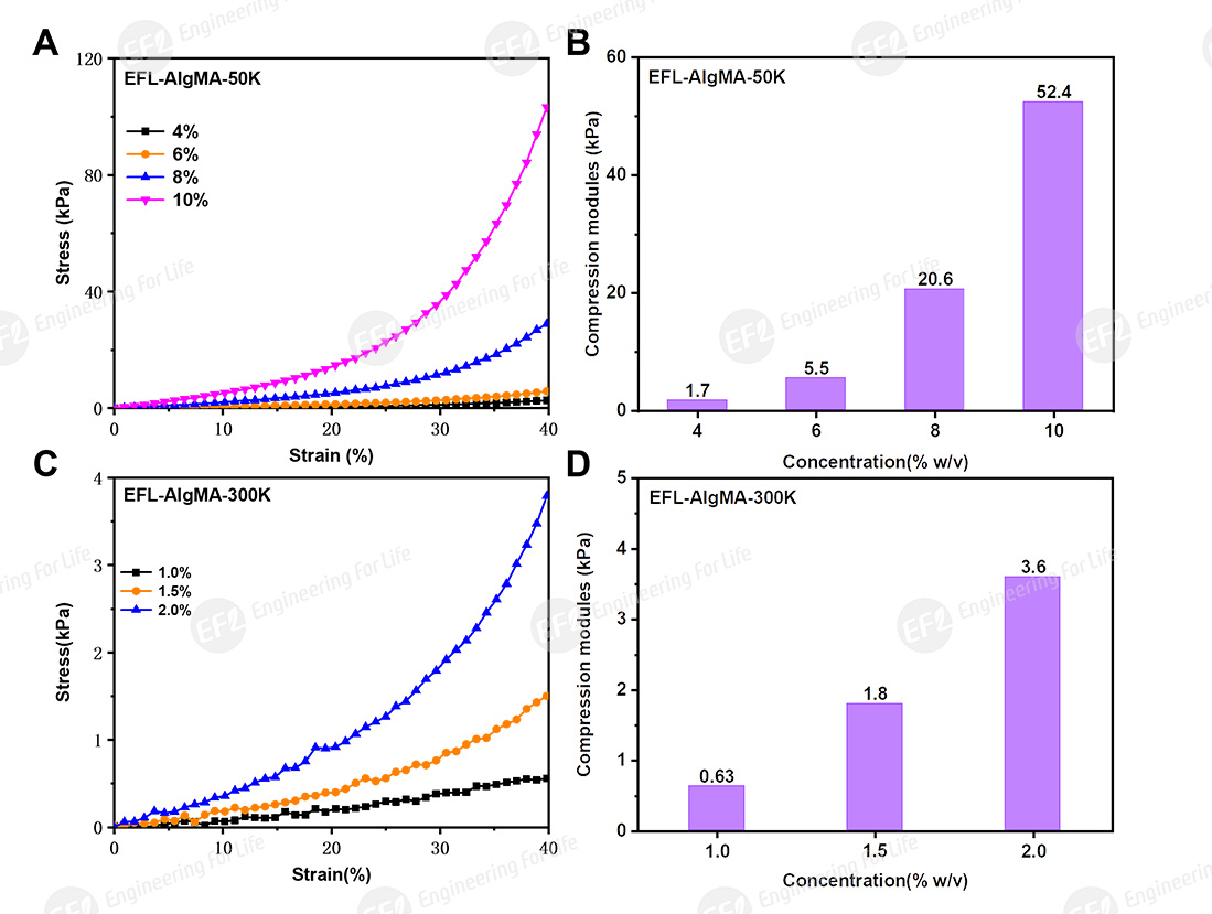 Fig 4. Compressive properties of AlgMA-50K/300K at different concentrations (405nm light source, 30mW/cm², 30s) : (A,C) stress-strain curve; (B,D) compression modulus