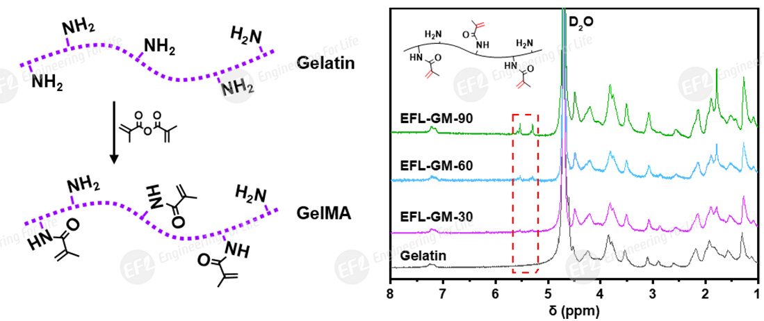 Fig 1. Synthesis reaction mechanism and NMR spectrum of GelMA