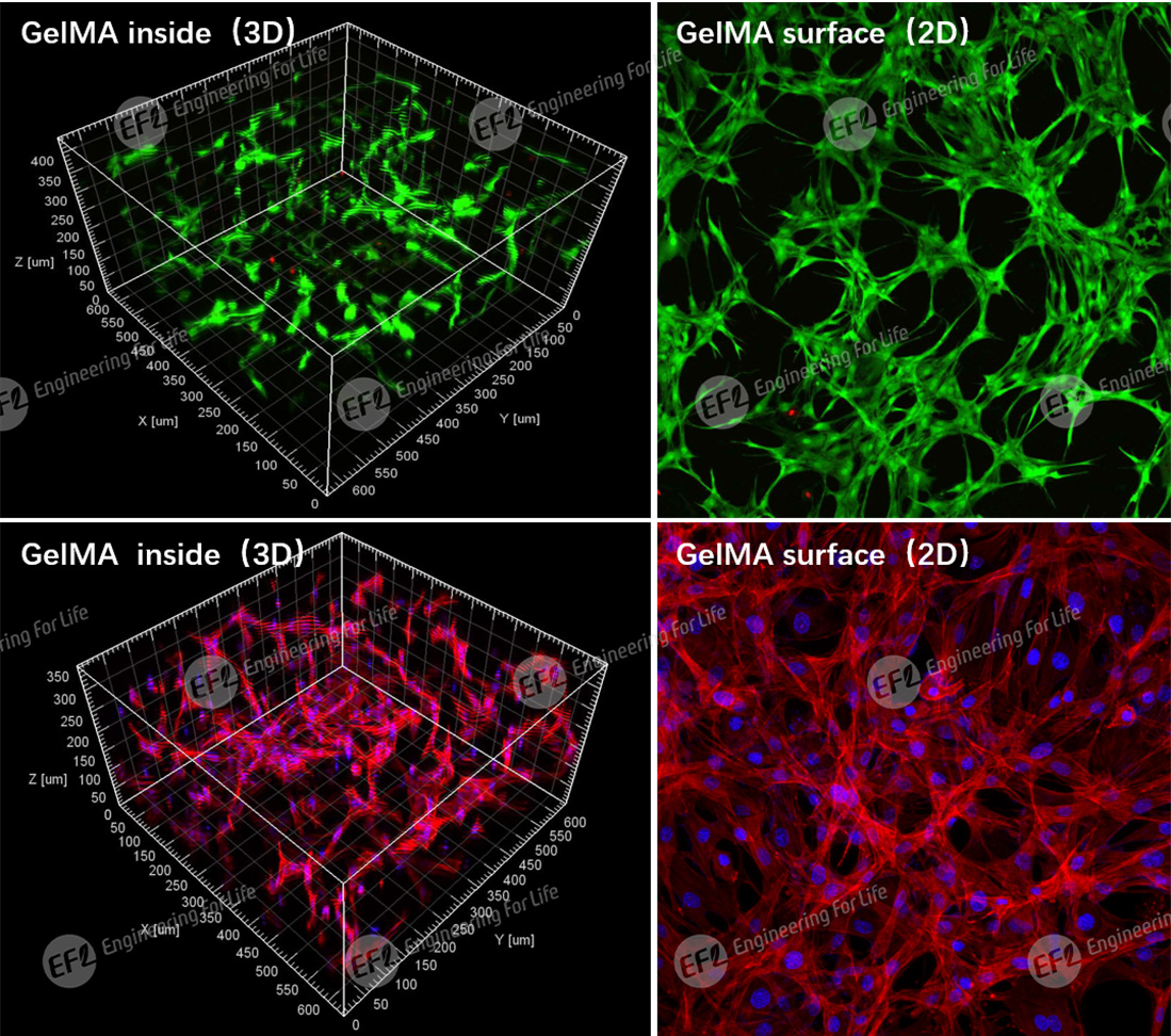 GelMA has been widely used for 2D/3D culture of stem cells, cancer cells, endothelial cells, nerve cells, cardiomyocytes, hepatocytes, chondrocytes and other cells. The cell survival rate is more than 90%, and the cell function is good