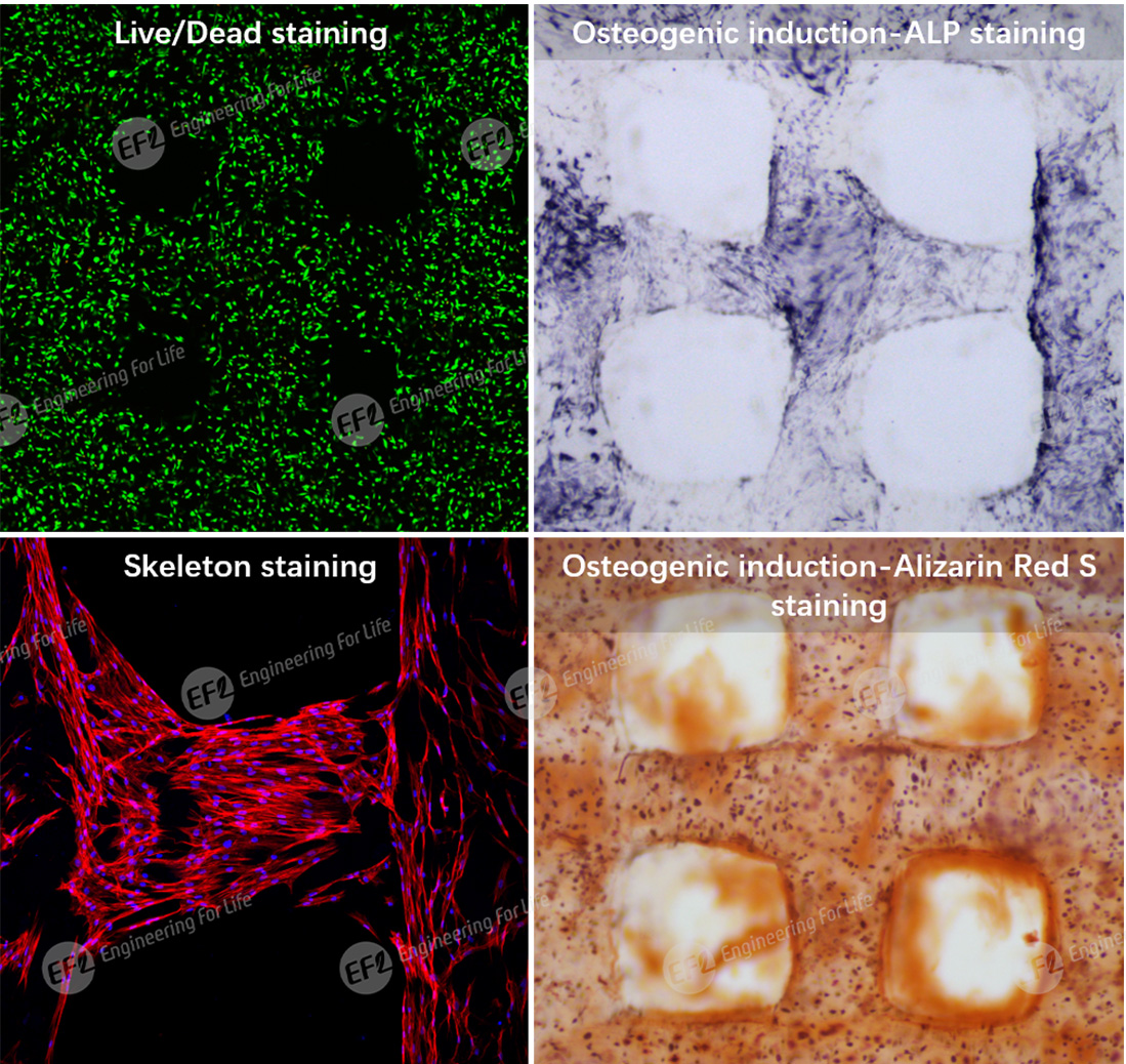 The EFL-GM series hydrogels have high curing speed and adjustable mechanical properties, which are suitable for extrusion bioprinting and projection photocurable bioprinting (DLP). Combined with the multi-functional extrudable 3D bio-printer (EFL-BP-66 series) and the projection photocurable 3D bio-printer (EFL-BP-86 series) independently developed by the EFL team, GelMA complex structure can be easily manufactured, the cell printing survival rate can reach 90%, and the cell function is good.