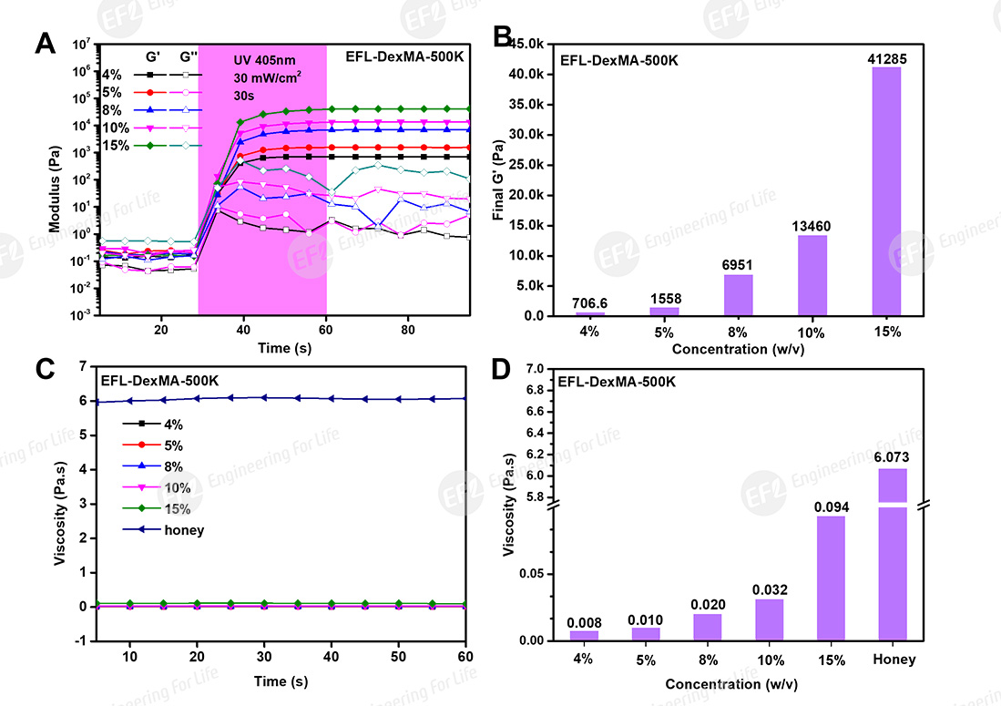 Fig 3. The rheological properties of DexMA-500K at different concentrations: (A) photocrosslinking process; (B) storage modulus G’ after curing; (C, D) viscosity