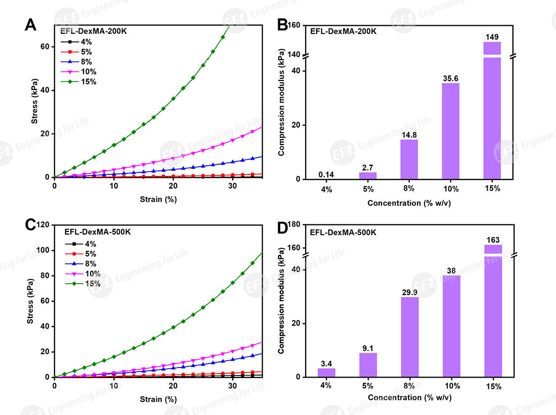 Fig 4. Compressive properties of DexMA-200K/500K at different concentrations: (A, C) stress-strain curve; (B, D) compression modulus