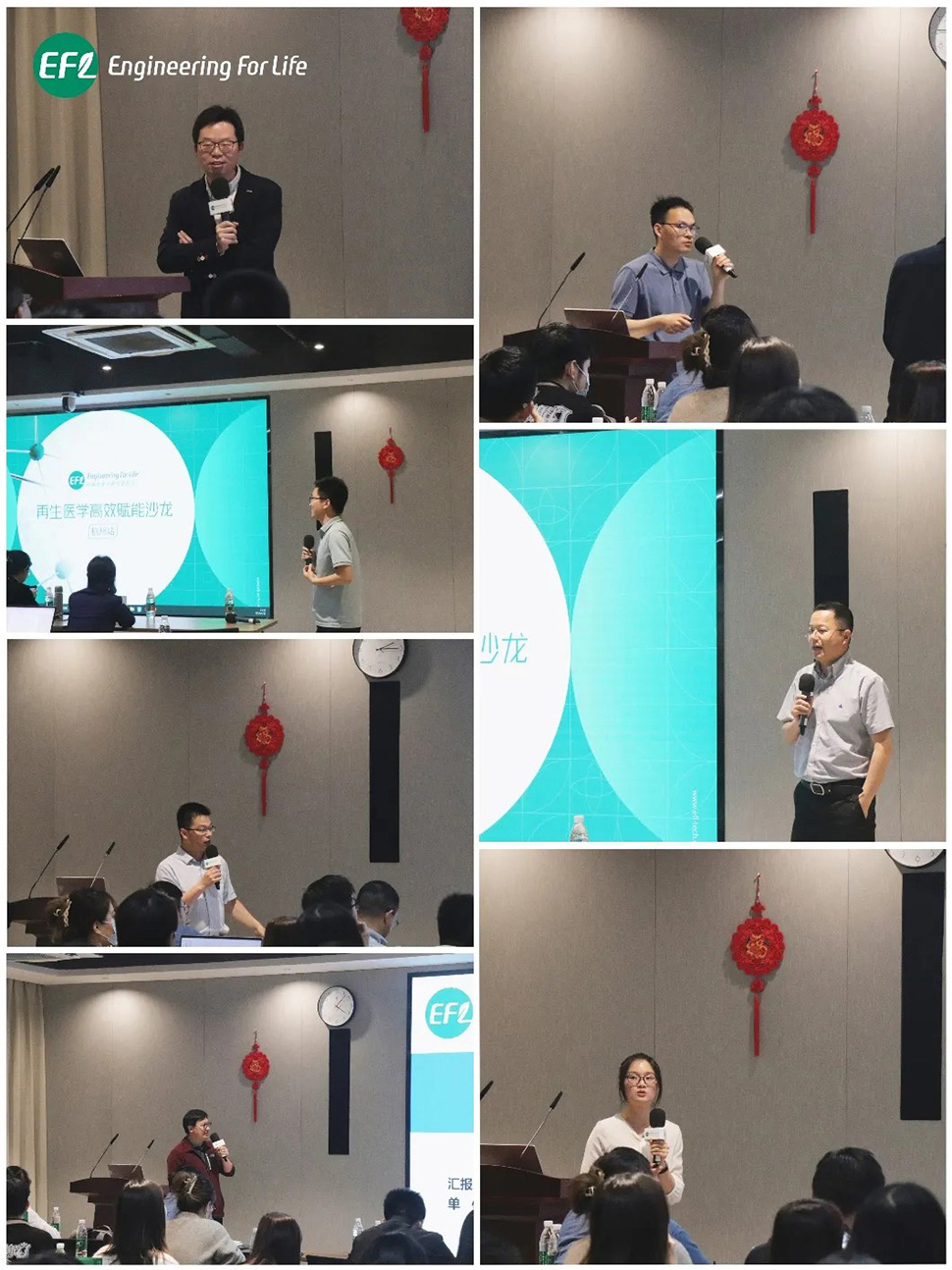开场,林贤丰研究员作了题为“基于细胞代谢调控的组织再生修复研究”的精彩报告,互动环节分享了Nature论文从idea获取、实验开展、论文投稿、修改回复等经验。接着,尹俊研究员进行了题为“多细胞连续数字光处理打印”的报告,介绍了一种温-光-磁多场辅助下的高精度DLP多细胞软组织打印方法,展现了在复杂生物组织构建中的应用潜力。第三个报告“生物3D打印:从器官模型构建到器官体外再造”由本次沙龙主席贺永教授带来,他分享了十多年医工交叉研究的历程以及团队的“Engineering for Life”理念,EFL通过标准化、量化的思路解决生物医学中劳动力密集、高学历蓝领现象,推动再生医学产业的智能制造。最后,EFL品牌联合创始人高庆博士分享了EFL的服务和合作机制,针对新进研究人员、一线研究主力军、资深PI/企业负责人分别面临的“从入门到精通再到转化,门槛高、投入大、周期长”的再生医学研究痛点,EFL开展“科普→服务研究→助力转化” 全环节服务,通过打造生物材料和生物制造两大技术平台,为追求可靠高效的再生医学研究人员提供生物医用水凝胶、生物3D打印装备、细胞观察与分析仪器等整体解决方案,为再生医学研究到转化全环节高效赋能。