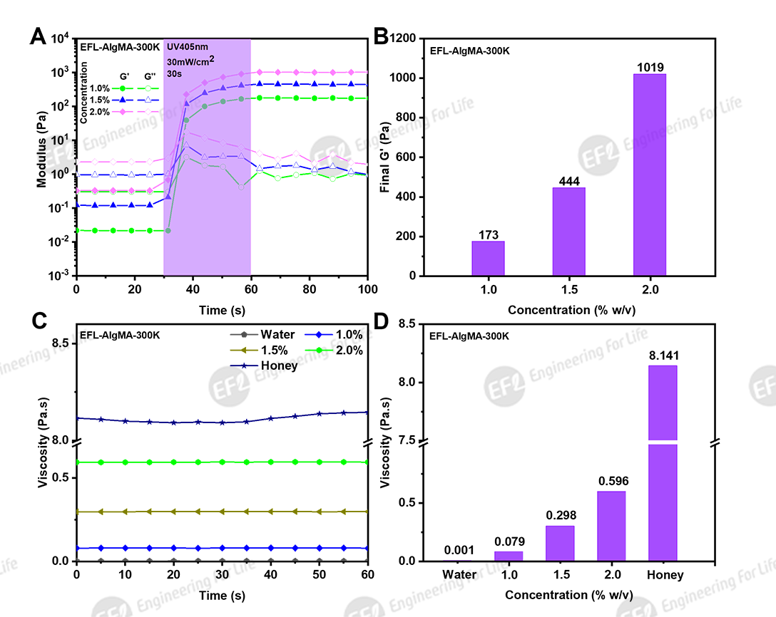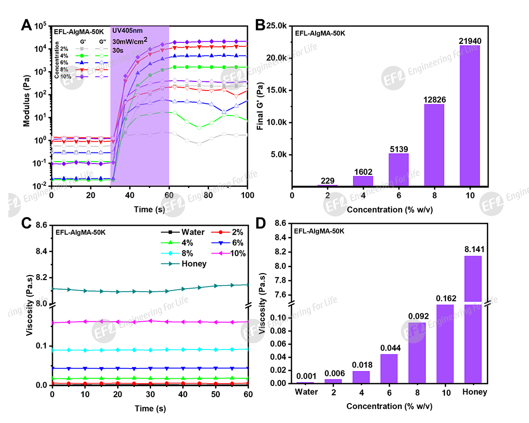 图2. EFL-AlgMA-50K不同浓度流变学特性:(A)光固化过程;(B)固化后储能模量G’;(C,D)黏度(蜂蜜及水为对照)