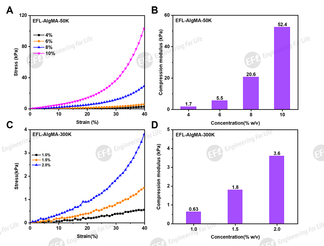 图4. EFL-AlgMA不同浓度光固化凝胶压缩特性(405nm光源,30mW/cm²,30s):(A,C)应力-应变曲线;(B,D)压缩模量