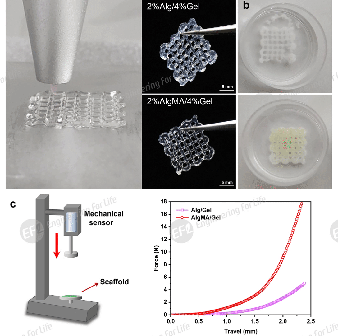 引入甲基丙烯基团的AlgMA可实现离子交联和光交联的双重交联性能,增强AlgMA基复合水凝胶的机械性能。EFLer以明胶(EFL-GEL-001)作为挤出式3D生物打印的辅助生物墨水,配合EFL团队研发的EFL-BP66系列多功能挤出式生物3D打印机,可实现基于海藻酸钠水凝胶网格支架的打印。具体的,基于Alg/Gel网格支架仅通过Ca2+交联成型,AlgMA/Gel网格支架同时通过Ca2+交联和UV光交联。试验表明,同等浓度下,相较于Alg/Gel,AlgMA/Gel网格支架具有更好的成型保真特性和增强的机械强度(图a/c)。