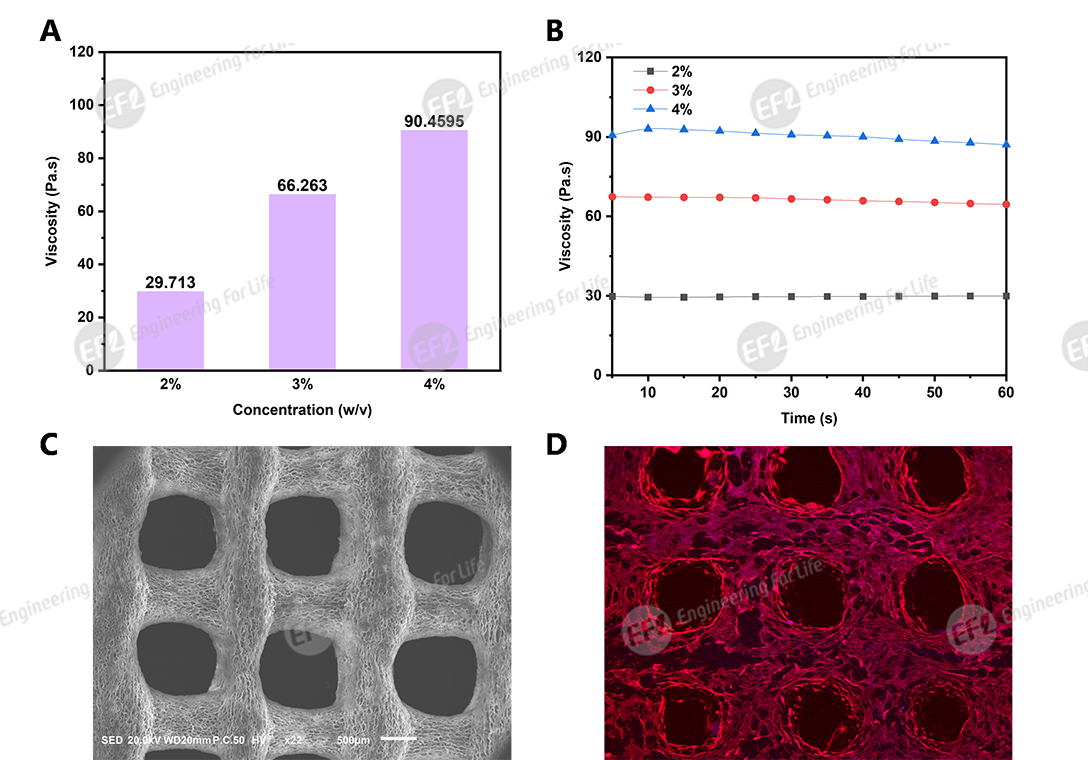 图1.(A,B)Ⅰ型胶原蛋白流变测试:黏度(剪切速率:10s-1,25℃);(C)冻干样本电镜示意图:3D打印Ⅰ型胶原蛋白支架SEM;(D)细胞培养效果:在生物3D打印的Ⅰ型胶原蛋白支架表面接种MC3T3-E1细胞,并利用TRITC-Phalloidin 罗丹明标记鬼笔环肽EFL-FA-001 进行细胞骨架染色标记