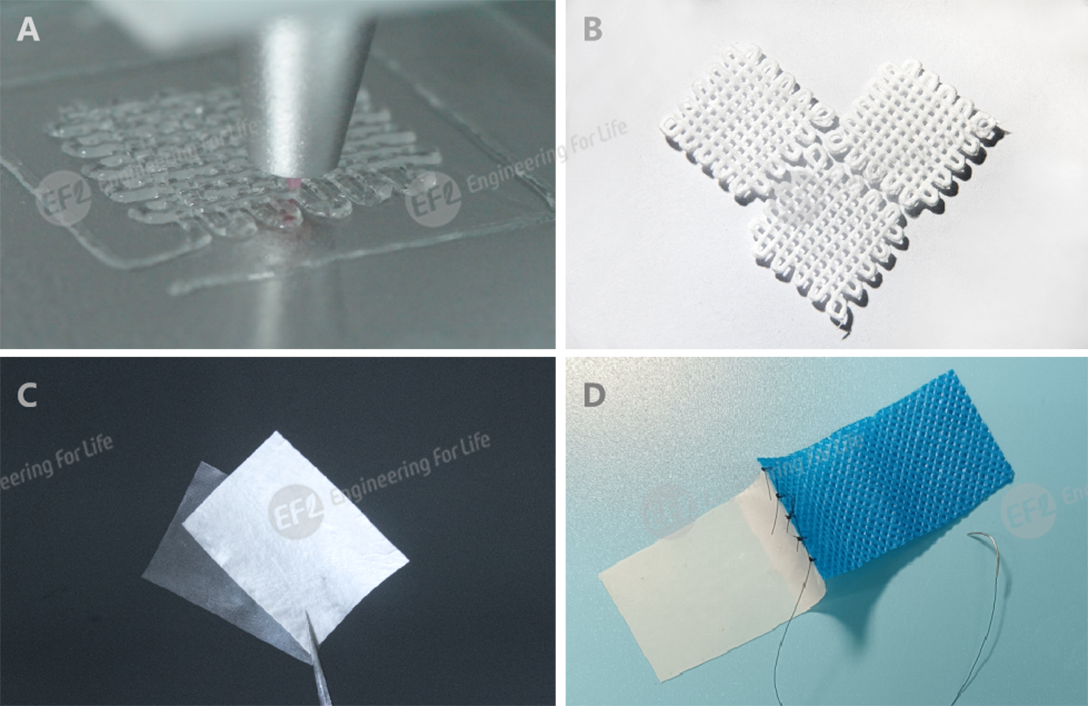 图2.(A)Ⅰ型胶原蛋白挤出式生物3D打印过程展示;(B)Ⅰ型胶原蛋白挤出打印支架用EDC/NHS化学交联后的效果展示;(C)Ⅰ型胶原蛋白制备的薄膜效果展示;(D)Ⅰ型胶原蛋白薄膜可缝合性展示