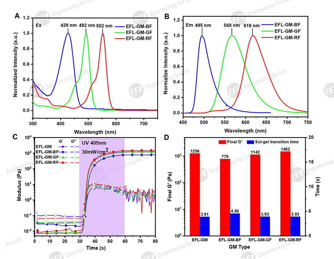 图1. 光学性质和流变特性:(A,B)三种荧光GelMA的紫外吸收和荧光发射数据;(C,D)荧光GelMA和普通GelMA的光固化过程流变学特征