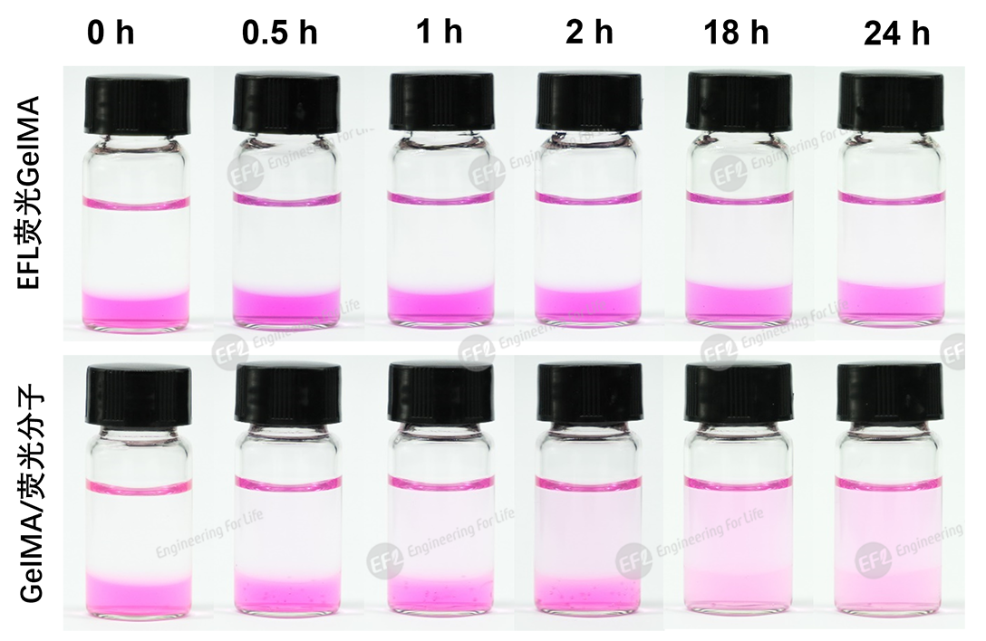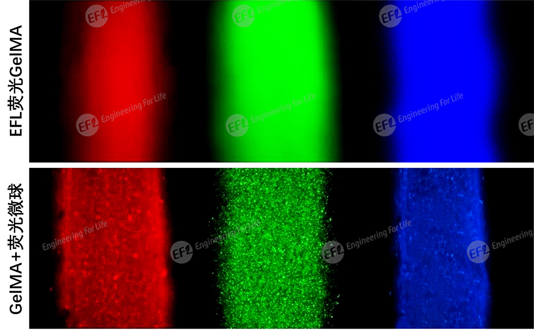 荧光GelMA产品(EFL-GM-RF/GF/BF系列)是通过在GelMA上“嫁接”荧光分子实现的,因所嫁接荧光分子不同而具有特定的荧光颜色。EFL团队研发荧光GelMA保持了原有GelMA的优良性质,克服了物理混合或静电吸附等方法中荧光分子容易扩散出体系的缺点,同时也避免了荧光微粒成像不均的缺点。