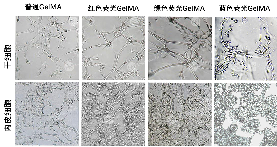 图4为使用荧光GelMA和普通GelMA培养骨干细胞和内皮细胞第五天时的生长状态,荧光GelMA与普通GelMA具有同等优异的生物相容性。