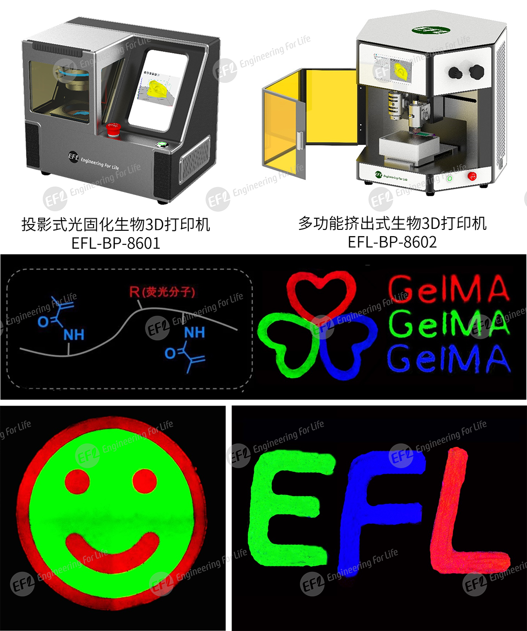 目前,GelMA已成为生物3D打印的明星墨水,荧光GelMA可使打印结构的表征更加清晰稳定。EFL团队研制的荧光GelMA可应用于全品类生物3D打印机,下图为EFL-BP系列生物3D打印机制造的荧光酷炫结构。