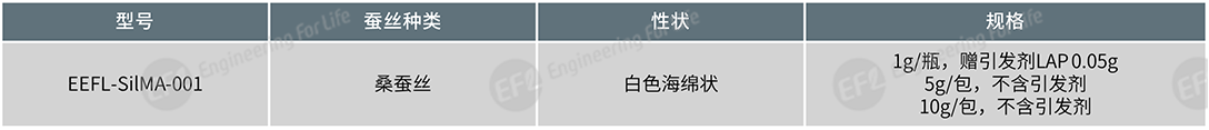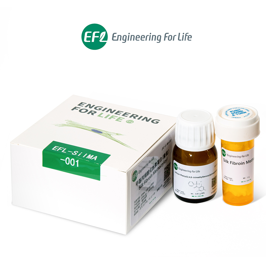 甲基丙烯酰化丝素蛋白(Silk Fibroin Methacryloyl, SilMA)是通过甲基丙烯酸缩水甘油酯对SF进行甲基丙烯酰化改性,在SF分子上引入双键。由于SF分子特殊的空间结构,其在改性前极易形成结晶而难溶于水。引入额外的化学基团后,其可在水中快速溶解,这使SilMA可被光固化为水凝胶。EFL团队推出的EFL-SilMA产品通过严格的原料筛选及品质监控,具有稳定的理化性质,其在可见光照射下10秒内便固化成胶,生物相容性良好,材料可扩展性强,能够提供多种黏弹特性以适应不同应用领域。