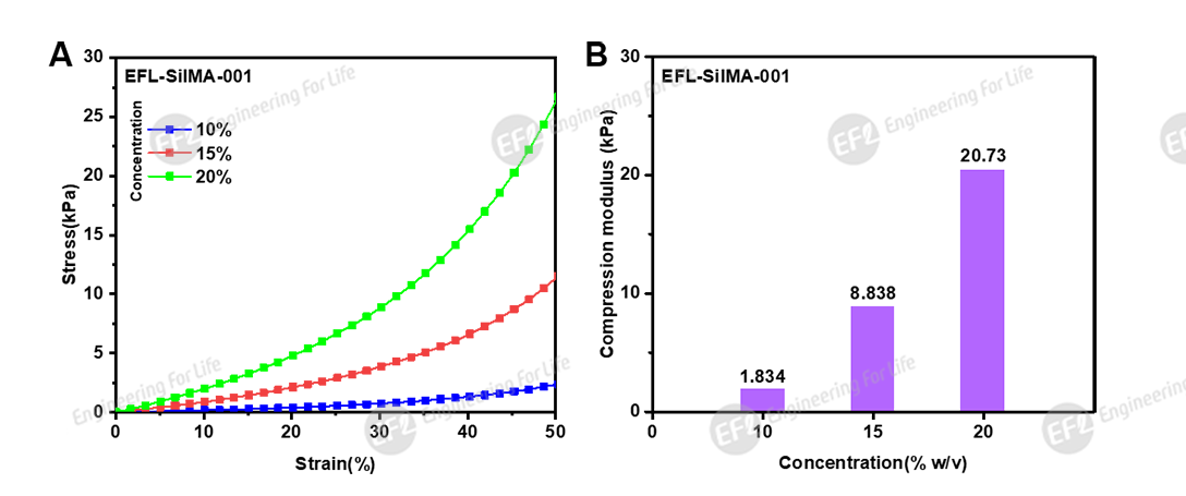 图3. EFL-SilMA不同浓度光固化凝胶压缩特性(405nm光源,30mW/cm²,30s):(A)应力-应变曲线;(B)压缩模量