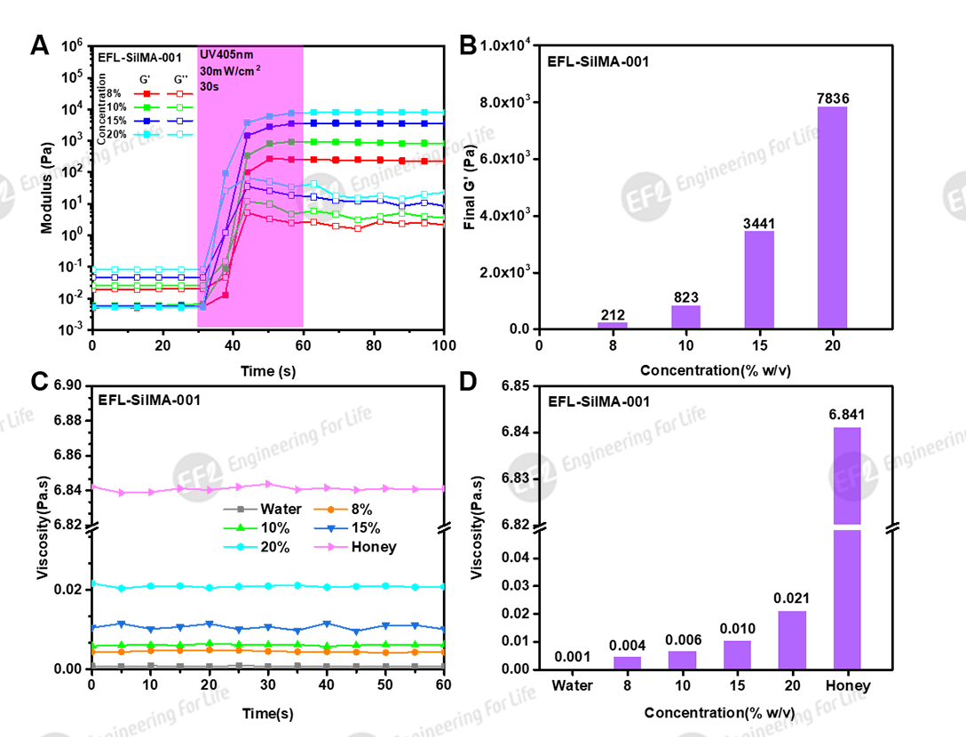 图2. EFL-SilMA不同浓度流变学特性:(A)光固化过程;(B)固化后储能模量;(C,D)黏度,纯水及蜂蜜作参考