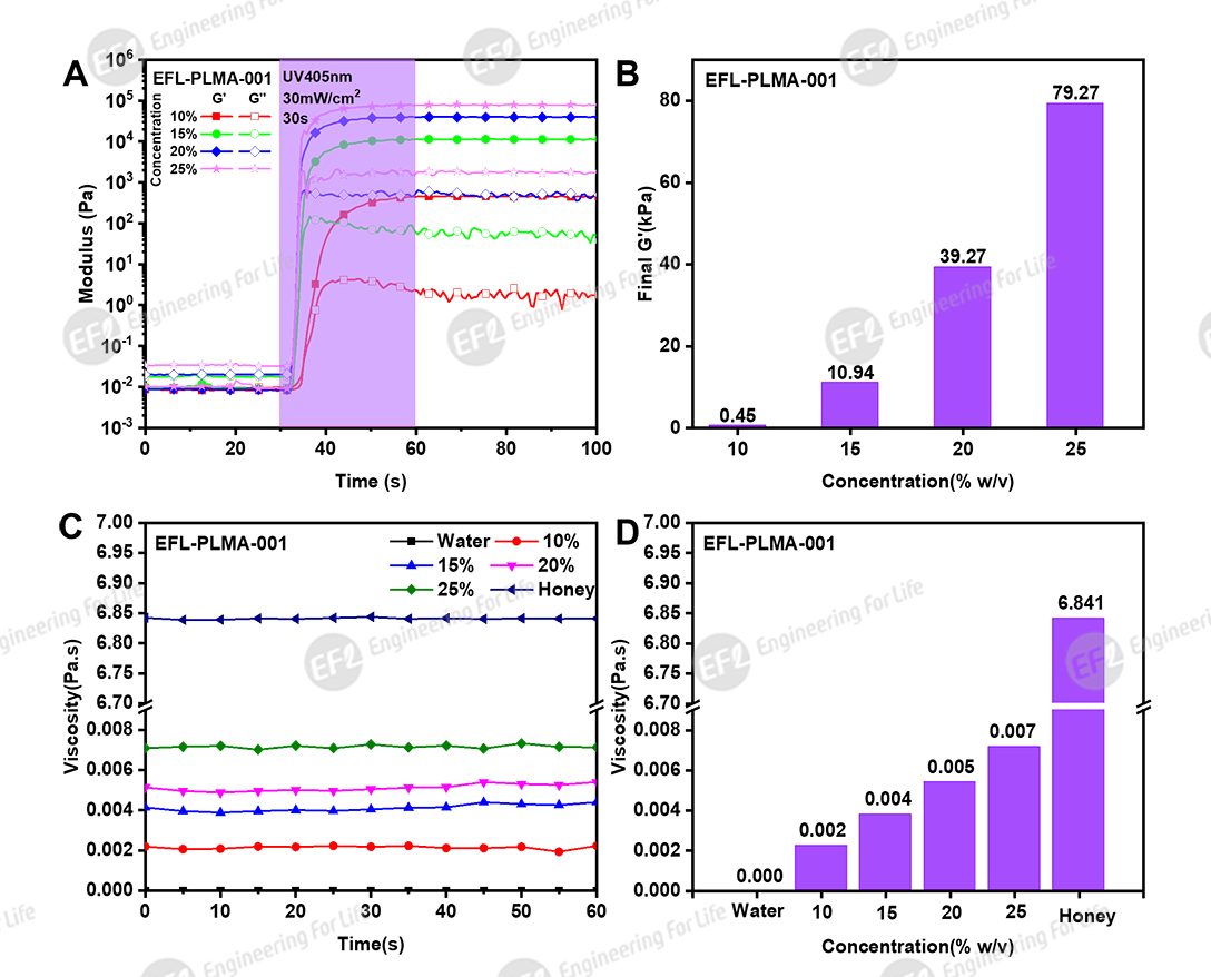 图2. EFL-PLMA-001流变特性:(A,B)光固化过程流变数据;(C,D) EFL-PLMA-001黏度数据(蜂蜜及水为对照)