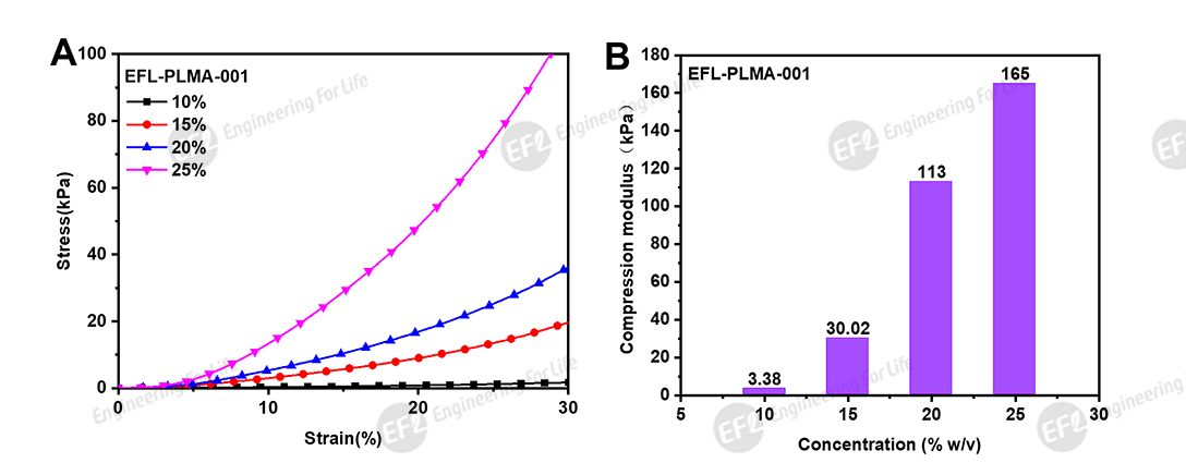 .图3. EFL-PLMA-001 不同浓度光固化凝胶压缩特性:(A)应力-应变曲线;(B)压缩强度