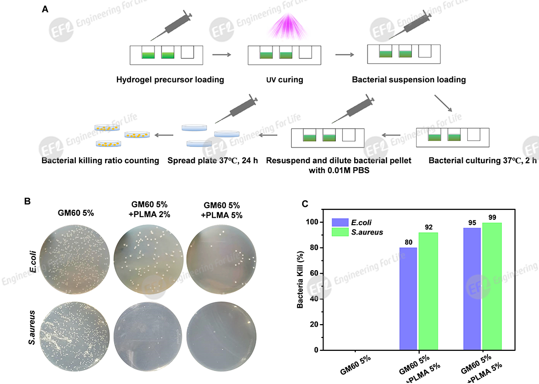 在凝胶组分中复合PLMA可显著增强凝胶的抗菌性能。EFLers以GelMA(EFL-GM-60)水凝胶为空白对照组,探究PLMA(EFL-PLMA-001)凝胶组分对大肠杆菌(E.coli)和金黄色葡萄球菌(S.aureus)的抗菌性能。试验表明,随着PLMA浓度的提高,GM60/PLMA复合水凝胶对E.coli和S.aureus抗菌性能逐渐增强(图4B/C)。