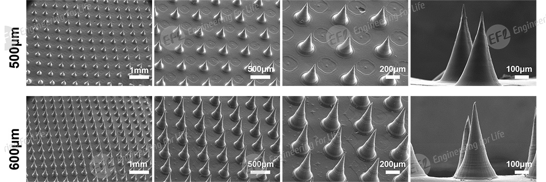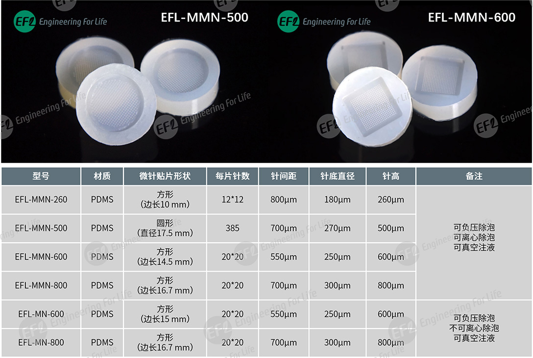 根据EFL技术支持团队与用户的长期沟通反馈,EFL团队优化了常用规格的微针模具,具体规格如下: