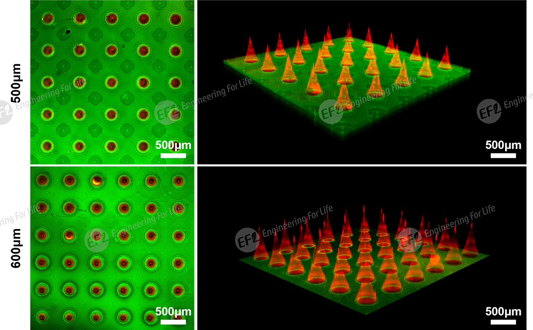 图3. 针高分别为500μm和600μm的微针CLSM图(针尖-罗丹明B标记,基底-荧光素标记)