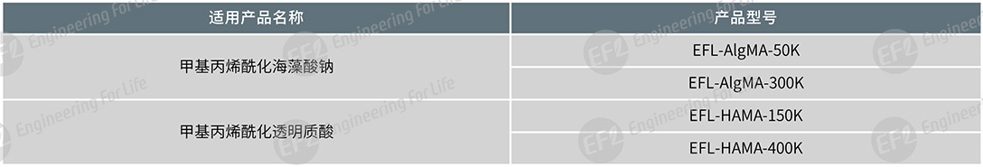 应用于甲基丙烯酰化海藻酸钠(EFL-AlgMA系列)、甲基丙烯酰化透明质酸(EFL-HAMA系列)水凝胶降解实验。