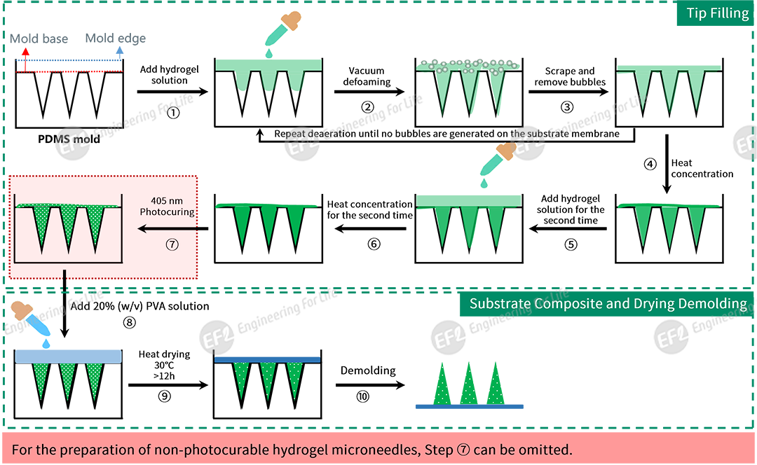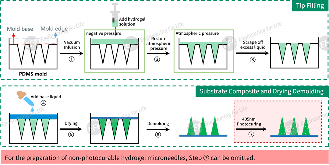 To address these issues and streamline microneedle preparation, EFL has developed a comprehensive solution covering key processes: material selection, mold adaptation, needle tip filling, and drying and demolding.