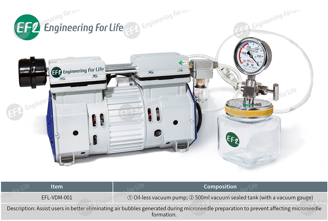 This solution includes materials for microneedle preparation, the Microneedle Molds, the Vacuum Defoaming Device, the Vacuum Liquid Filler, and the Microneedle Drying Kit.